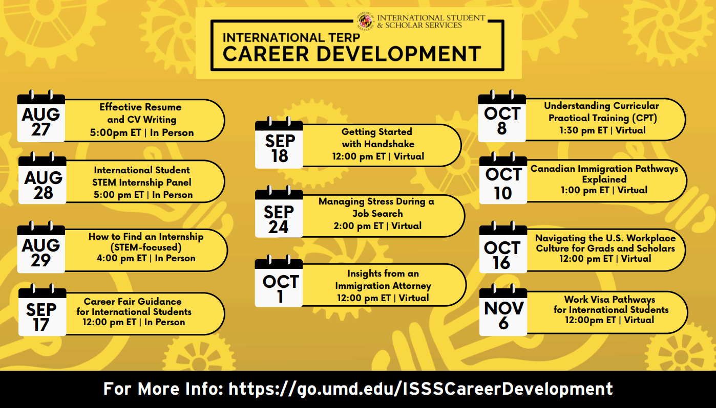 Participants in the program will engage in workshops, networking events, and webinars that cover topics such as resume building, interview skills, job search strategies, visa compliance information, and cultural competence in the workplace. By fostering professional development and a sense of community, the International Terp Career Development offers participants valuable skills, support, and confidence as they navigate their career journeys alongside peers, mentors, and industry professionals.